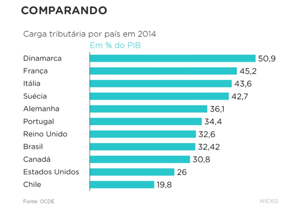 A carga tributária no Brasil está na média dos países da OCDE (Organização para a Cooperação e Desenvolvimento Econômico). A parcela dos recursos que vai para o pagamento de tributos pode ser comparada com a de países como Portugal, Canadá e Reino Unido, mais ricos e com Índice de Desenvolvimento Humano melhores que o brasileiro.