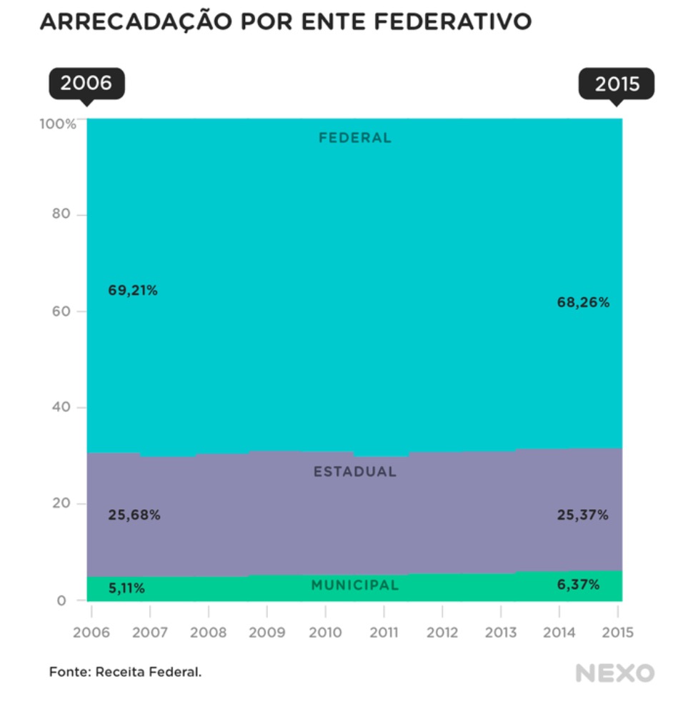 Prefeitos e governadores reclamam constantemente que o modelo federativo brasileiro privilegia a União. A distribuição dos tributos entre municípios, Estados e governo federal continua muito desigual. A União concentra quase 70% do dinheiro arrecadado em um quadro que pouco se altera.
