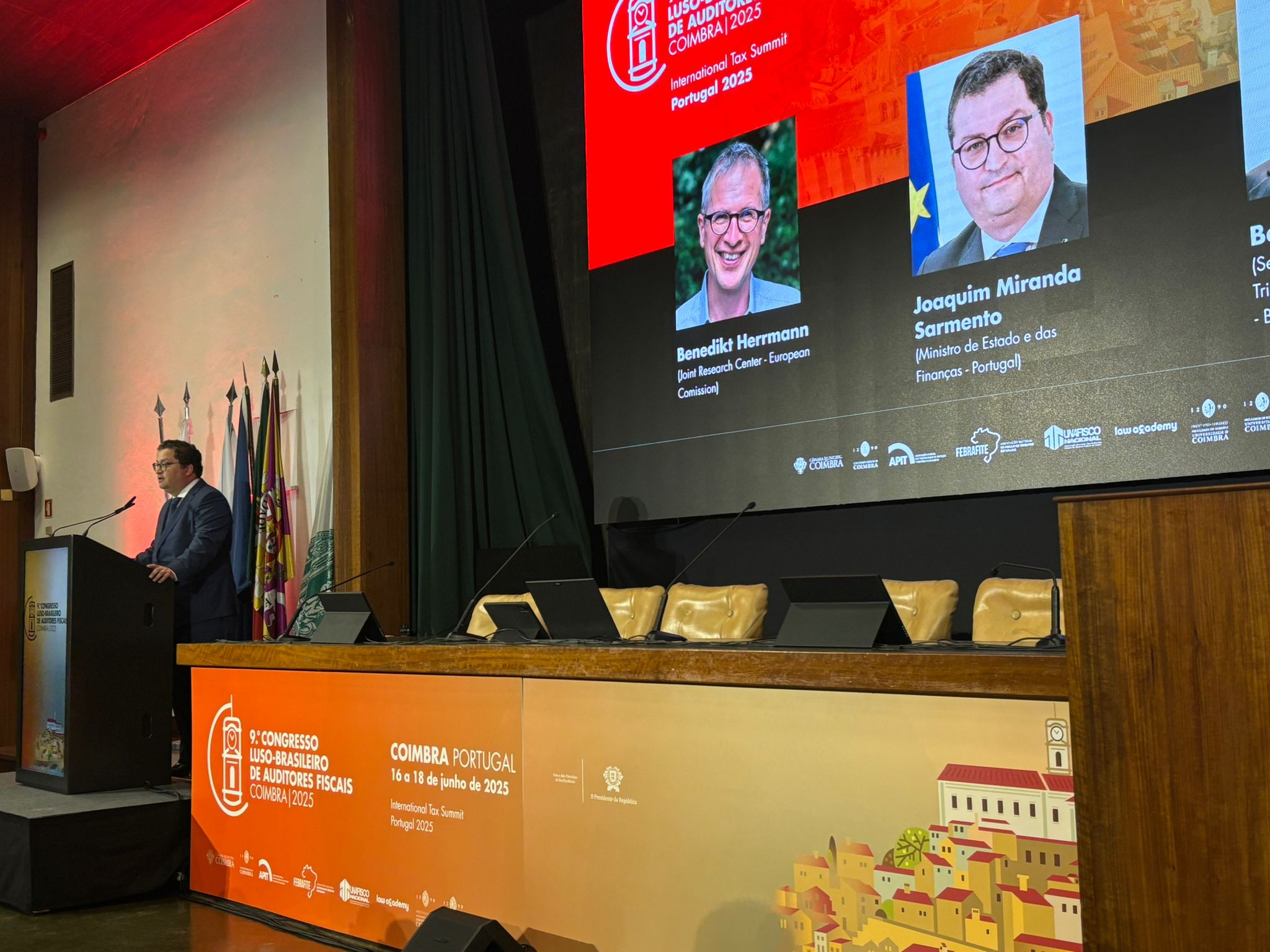 Três visões complementares sobre os desafios fiscais contemporâneos marcaram a palestra magna de abertura do 9º Congresso Luso-Brasileiro de Auditores Fiscais, na tarde desta segunda-feira (16), em Coimbra. Com foco em crescimento econômico, descentralização fiscal e reforma tributária, o encontro reuniu o Ministro das Finanças de Portugal, Professor Doutor Joaquim Miranda Sarmento; o economista Benedikt Herrmann, do Joint Research Center da Comissão Europeia; e o Secretário Especial para a Reforma Tributária do Brasil, Bernard Appy. A mesa inaugural deu o tom do Congresso, reafirmando o compromisso com a construção de sistemas fiscais mais simples, justos e alinhados ao desenvolvimento sustentável.